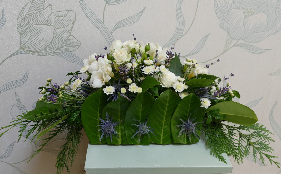 The colour scheme was blue and white and Zoe's wedding bouquet consisted of Rosa 'Avalanche', white spray roses, Eryngium, lavender, cornflowers, double white Lisianthus, Chrysanthemum 'Stallion', rosemary and Eucalyptus 'Baby Blue'. Her two bridesmaids had a smaller version each and the buttonholes for the men matched the colours too.